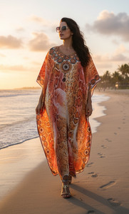 Bohemian spring resort kaftan dresses and wrap skirts capture the essence of free-spirited style with a touch of elegance and comfort. These garments are perfect for leisurely strolls along the beach, relaxing by the poolside, or enjoying a sunny day at a resort. Here's a brief description of each: