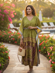 The boho-inspired kaftan dress is a handmade treasure crafted from repurposed saris, making it a versatile piece perfect for the beach, pool, or as a stylish cover-up. This kaftan features a stunning purple print on a neutral beige background, complemented by a flattering V neckline and a stretchy waistband for ultimate comfort and effortless accessorizing. The one-size-fits- all design seamlessly blends comfort and bohemian flair, highlighted by its light and airy fabric, ensuring you stand out with ease.