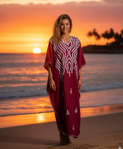 The kimono-style caftan is ideal for a beach vacation and perfect for travel and resort days. Easy to dress up with jewelry and chic shoes, it fits sizes SML effortlessly. The kimono sleeves and low V-neck with bust elastic enhance your silhouette, making this kaftan a flattering choice for all body types.